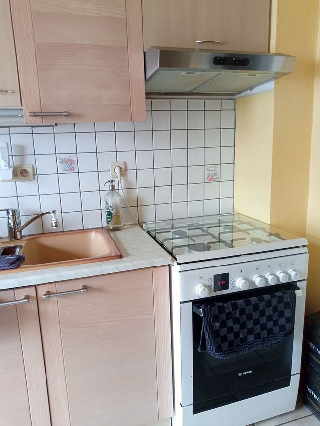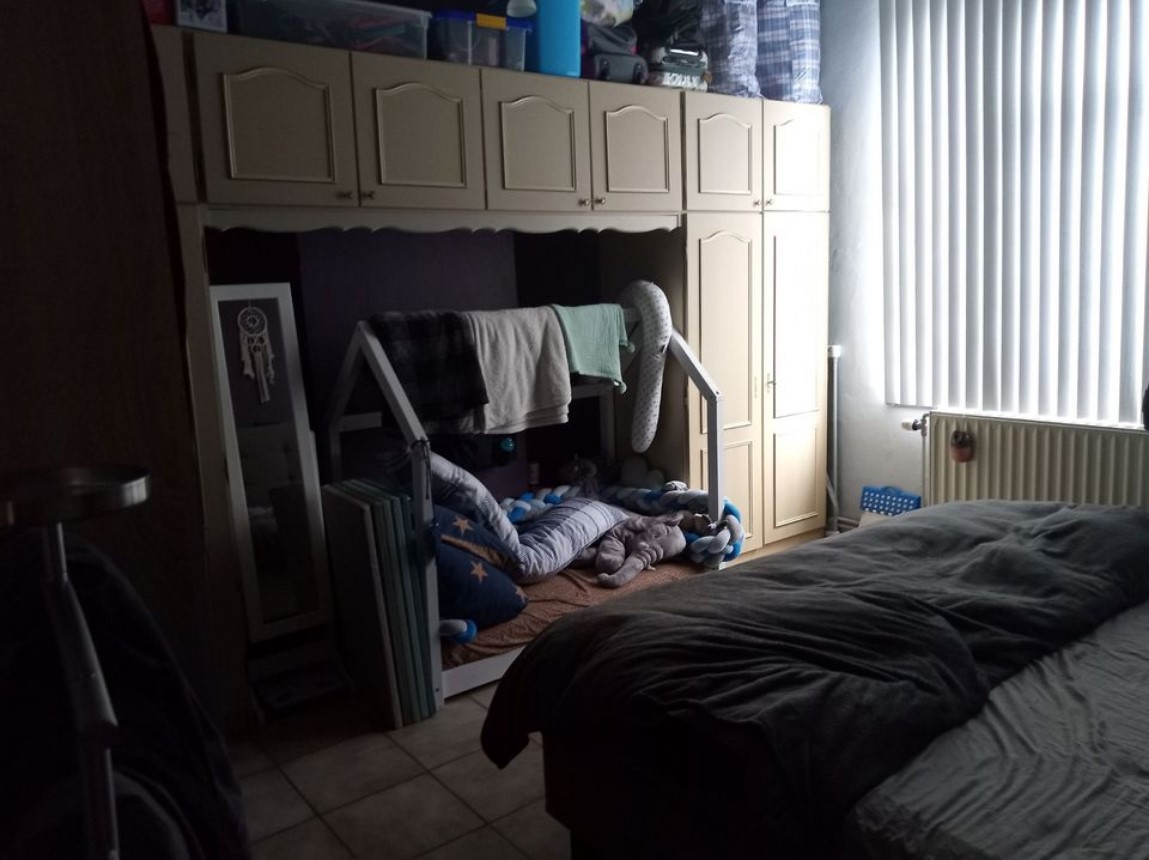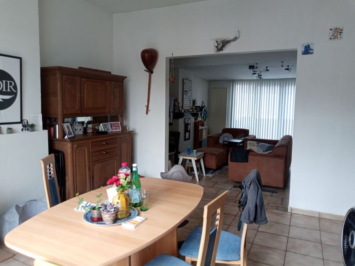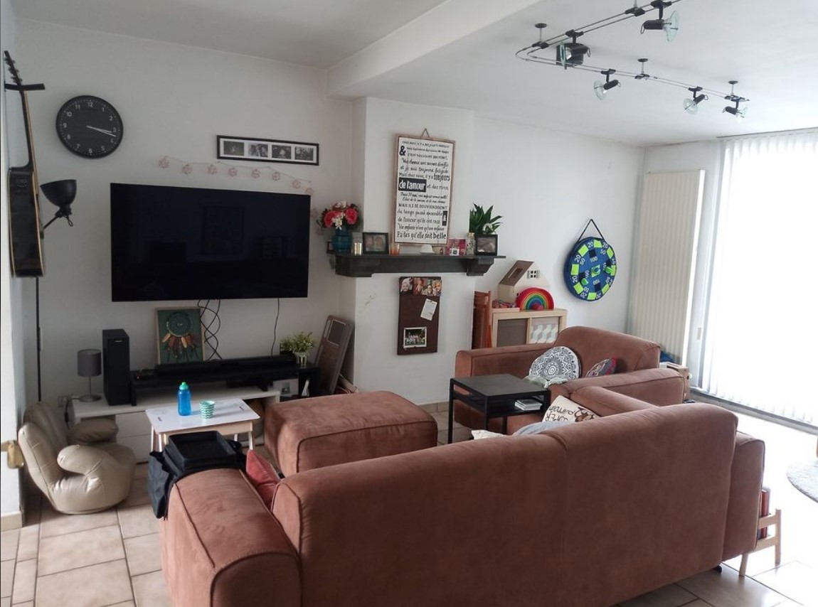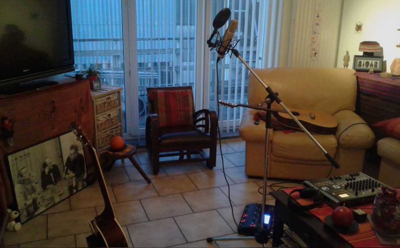 hall d'entrée, salle d'eau de 1,55 x 2.79 m, wc séparé, cave buanderie et une pièce de vie équipée d'un coin cuisine de 7,75 m x 3,90 m. qui servait de studio (divant lit) et de bureau / studio de répétition & enregistrement (cfr photo avec les guitares au mur)