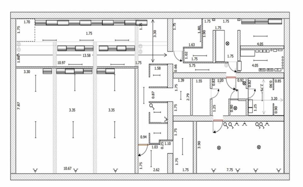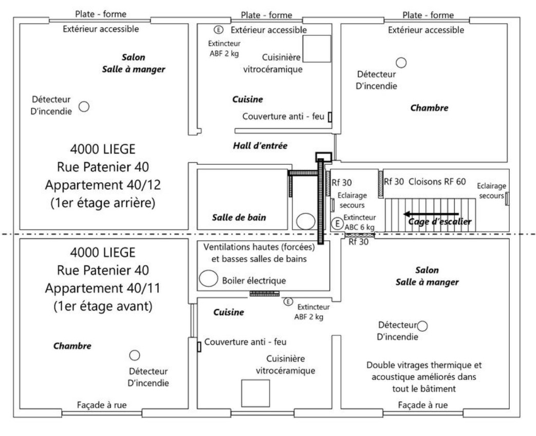 Il est prévu dans le couloir un faux plafond et des contre-murs isolants de 100 mm ainsi que des doubles portes d'accès, ce, pour contribuer à améliorer encore l'isolation thermique et acoustique du bâtiment ainsi que les plus hautes normes de sécurité incendie. Cela pour préserver également l'esthétique du bâtiment qui peut ainsi conserver ses portes massives de style