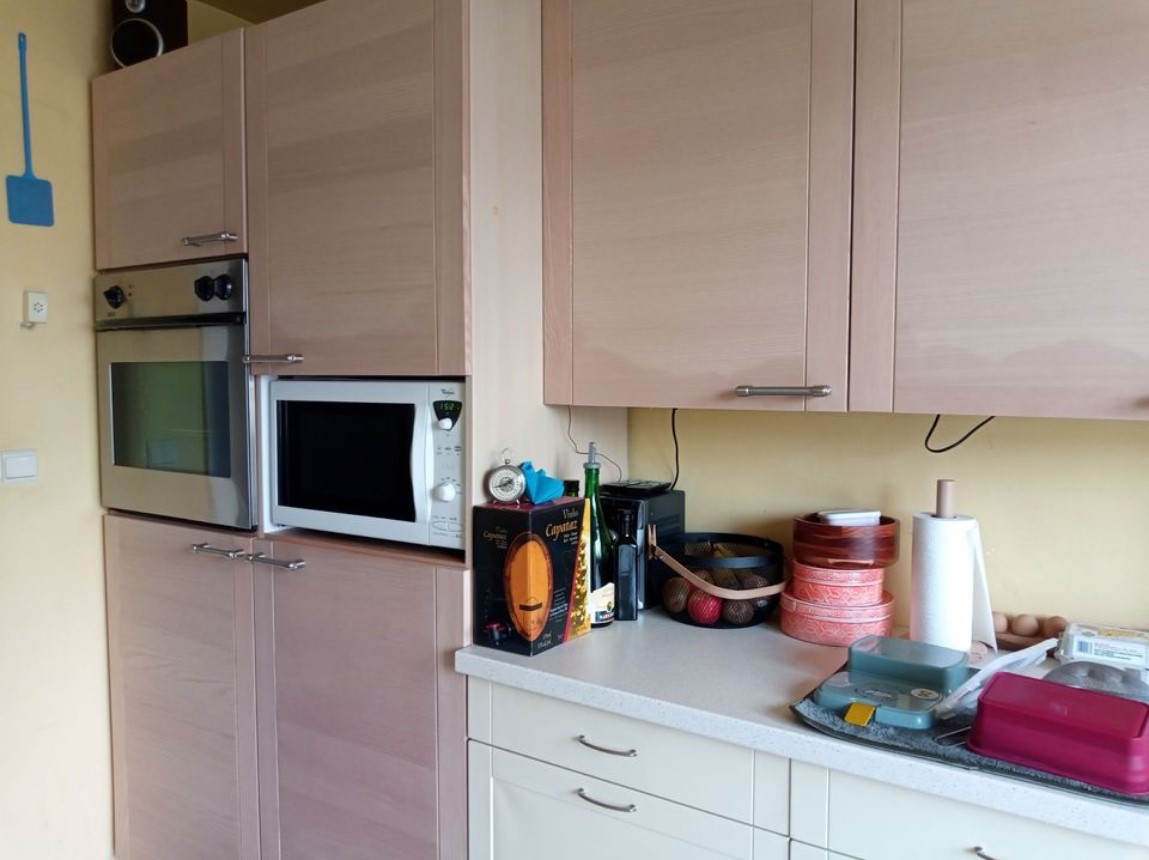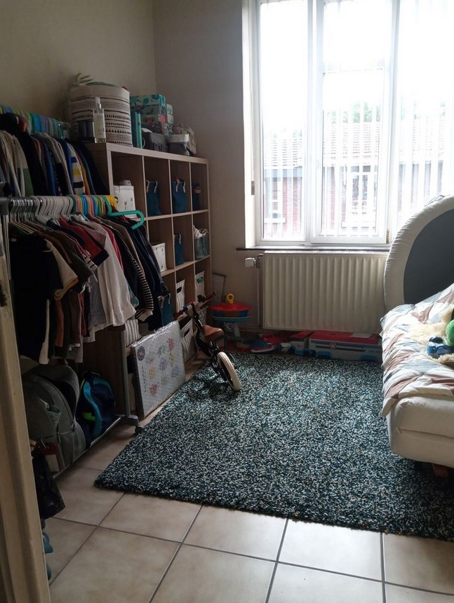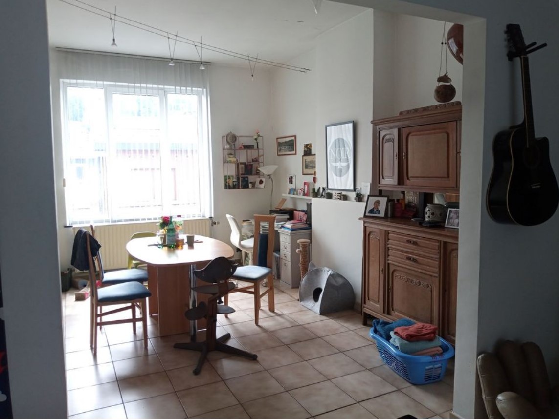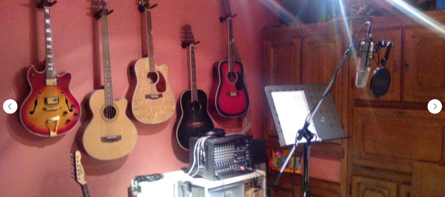 hall d'entrée, salle d'eau de 1,55 x 2.79 m, wc séparé, cave buanderie et une pièce de vie équipée d'un coin cuisine de 7,75 m x 3,90 m. qui servait de studio (divant lit) et de bureau / studio de répétition & enregistrement (cfr photo avec les guitares au mur)