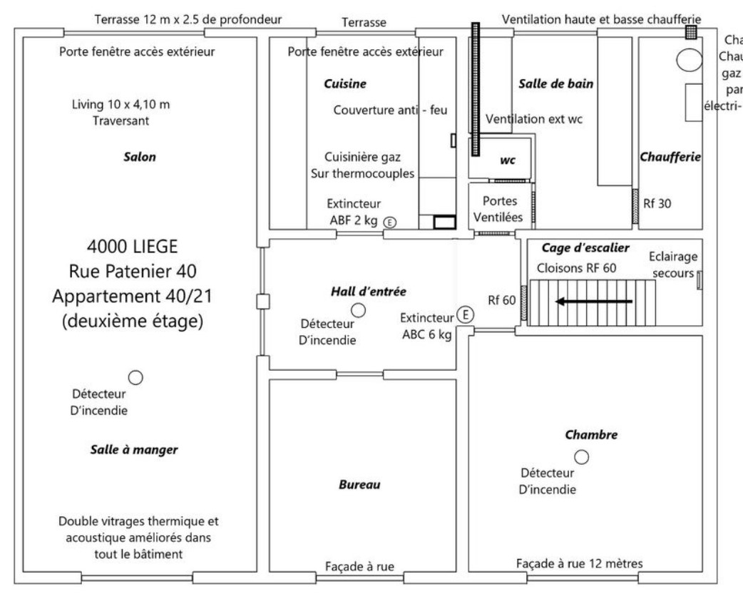 Il est prévu dans le couloir un faux plafond et des contre-murs isolants de 100 mm ainsi que des doubles portes d'accès, ce, pour contribuer à améliorer encore l'isolation thermique et acoustique du bâtiment ainsi que les plus hautes normes de sécurité incendie. Cela pour préserver également l'esthétique du bâtiment qui peut ainsi conserver ses portes massives de style